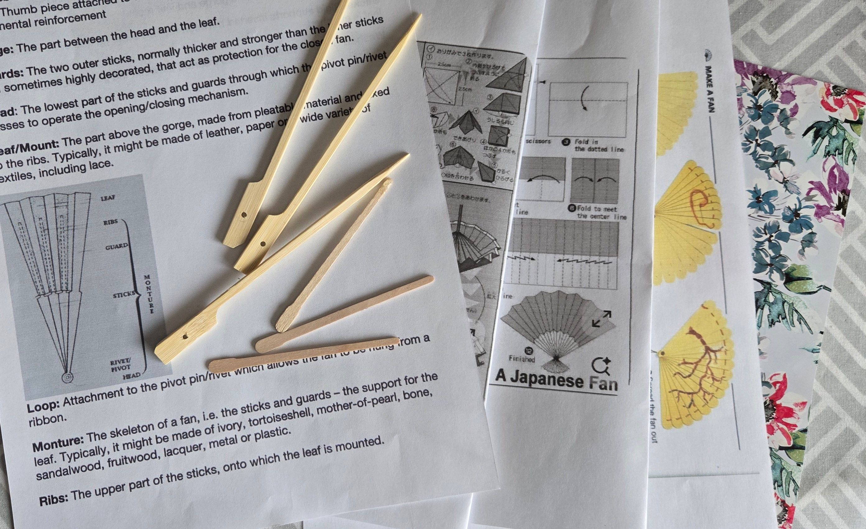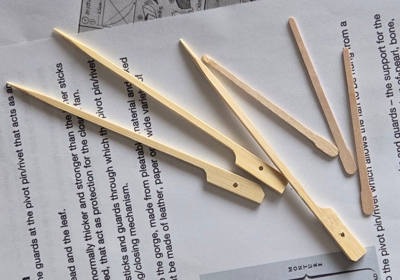The next attempts in fan production will use some nice chintz fabric in the shop stock and appropriate scrapbooking paper, set up on the larger skewer sticks. Decorative guards for the fans will be added as well. Overall, the ladies are happy with the choices and hope to see more fans in the offing.