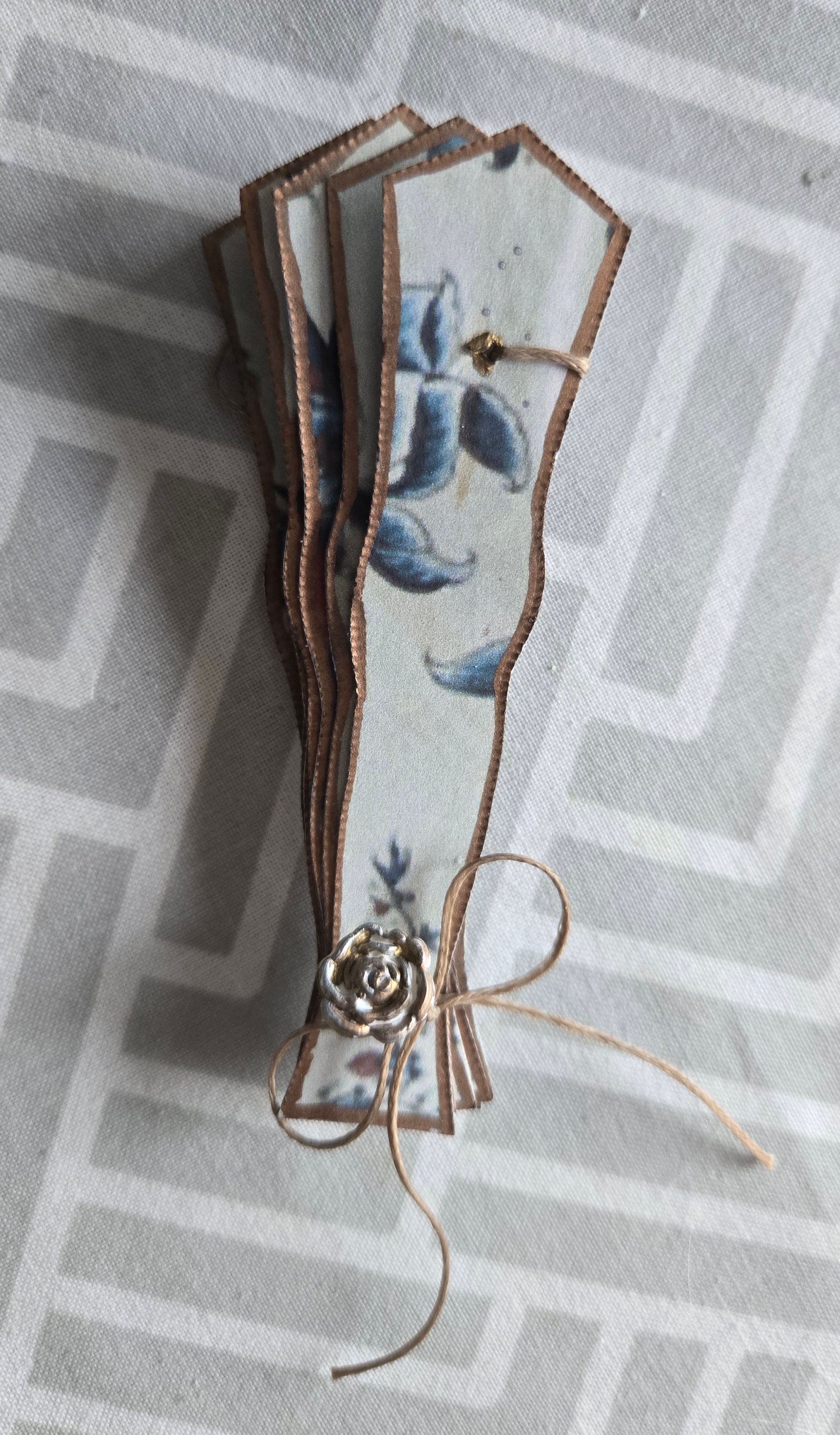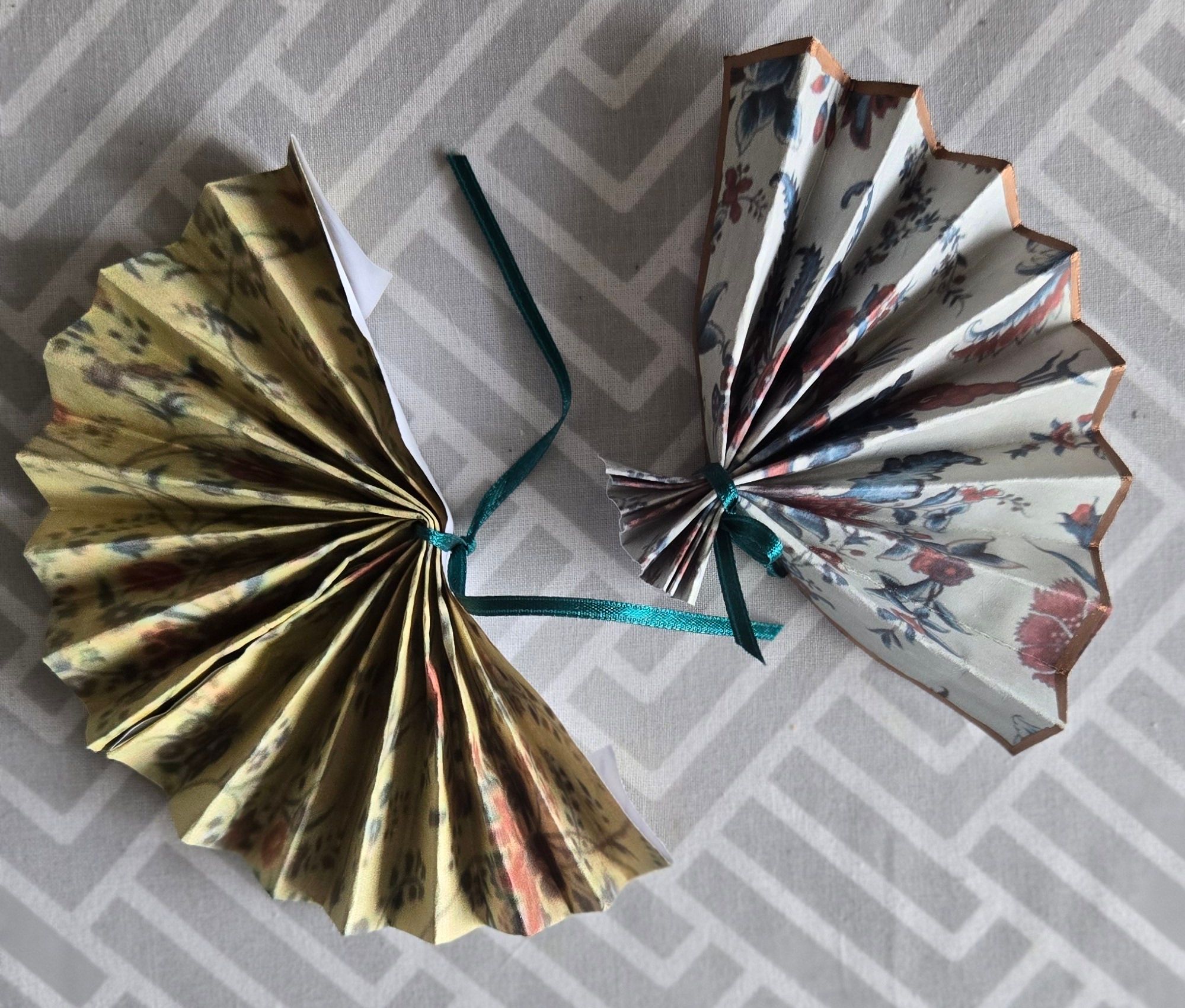 The designer liked this fan so much she decorated it right away, using metallic Sharpie pens and a button. You will see some more Sharpie decoration on the other fans too. An old pair of serrated scissors, used to cut knits, created a happy accident, giving a decorative edge to the staves. The buyer is now on the look out for some scrapbooking scissors. And paper.