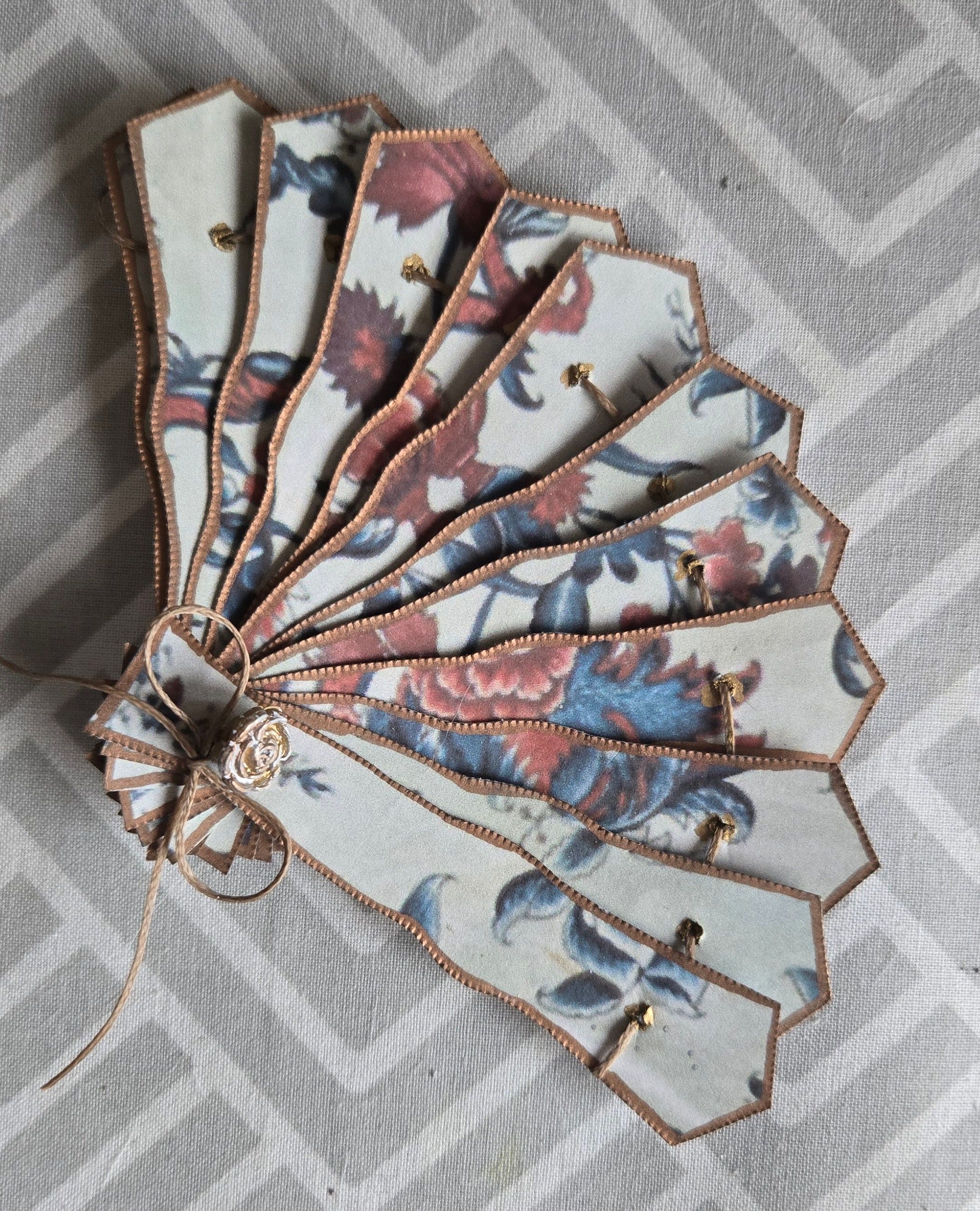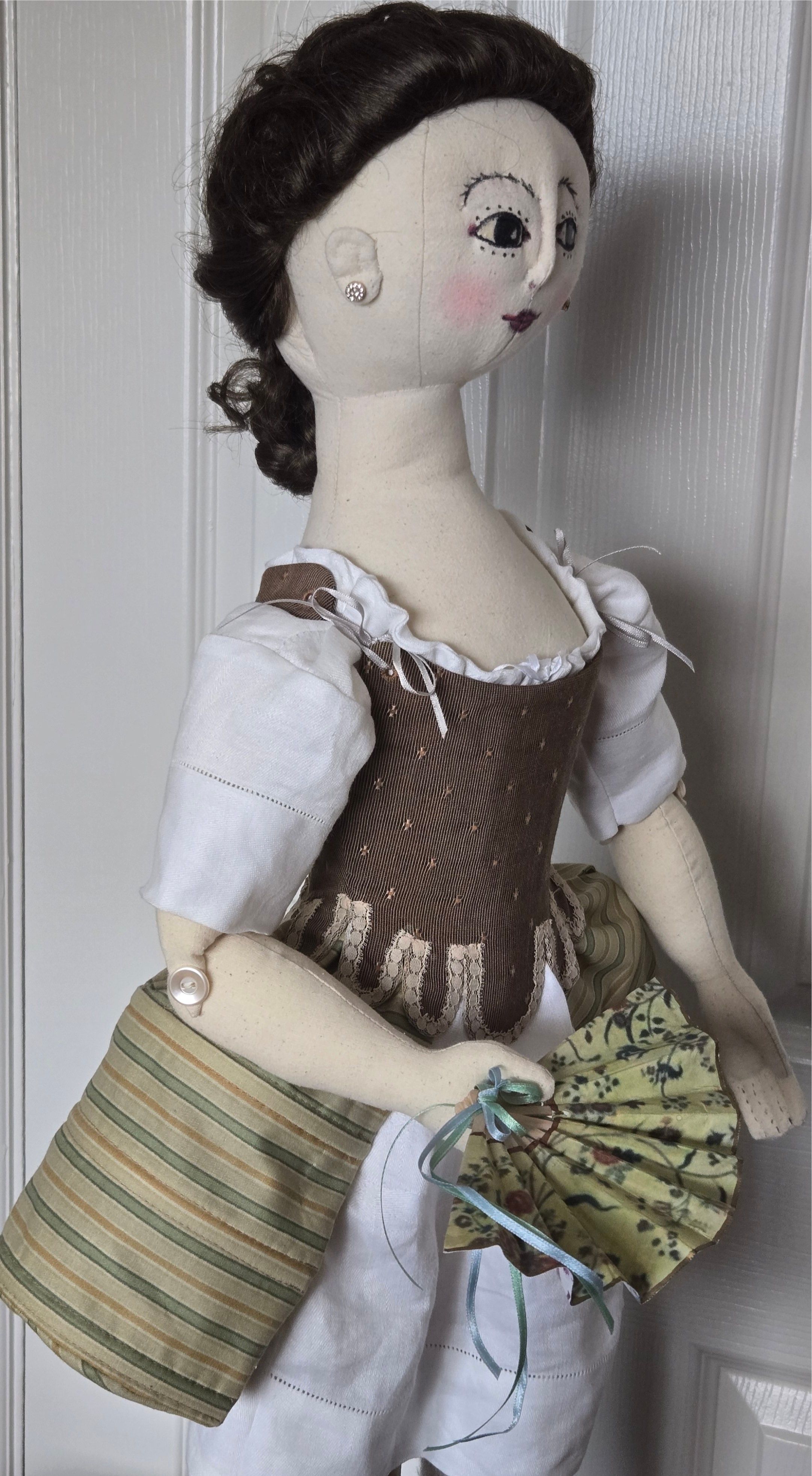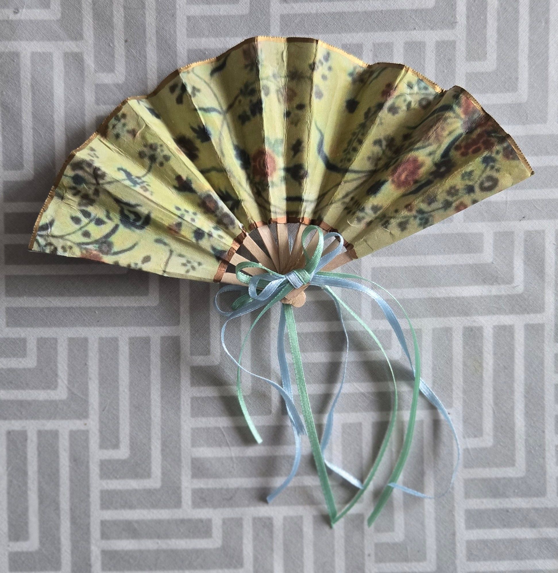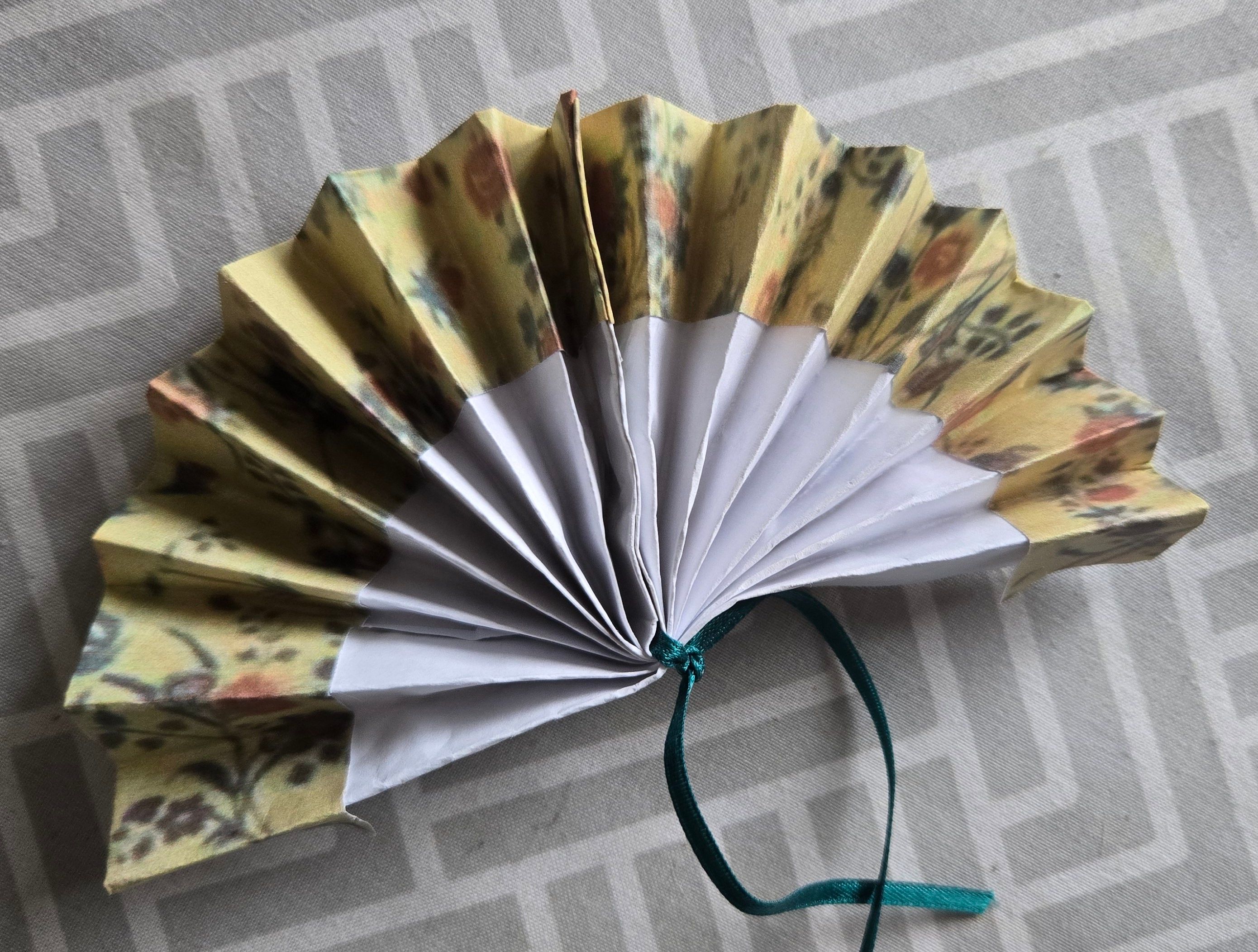 There is a great deal of information on the internet, particularly Pinterest, on how to make folding fans. While the shop stocked up on glue, the designer made a selection of papers and patterns to print off to form the leafs. She also found lots of ribbons and trim for an 18th Century look. Since these were prototype fans, no one suggested painting Rococo scenes on the leafs. Later maybe?