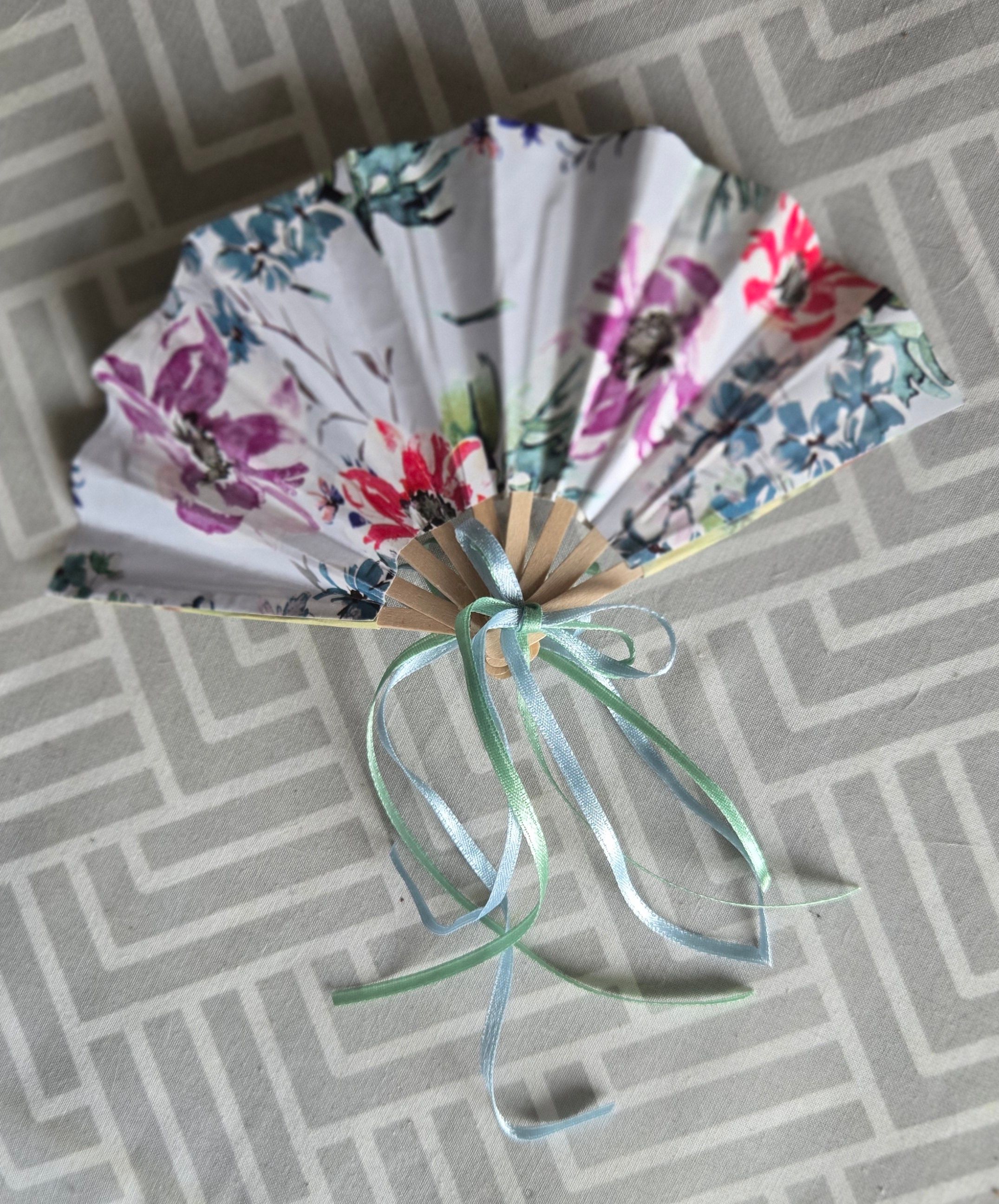 The most effective of the prototypes was a folded fan using the smaller sticks and glued to remain open. The sticks are enclosed by a second layer of paper. The ribbons cover up the sticks layered at the bottom.