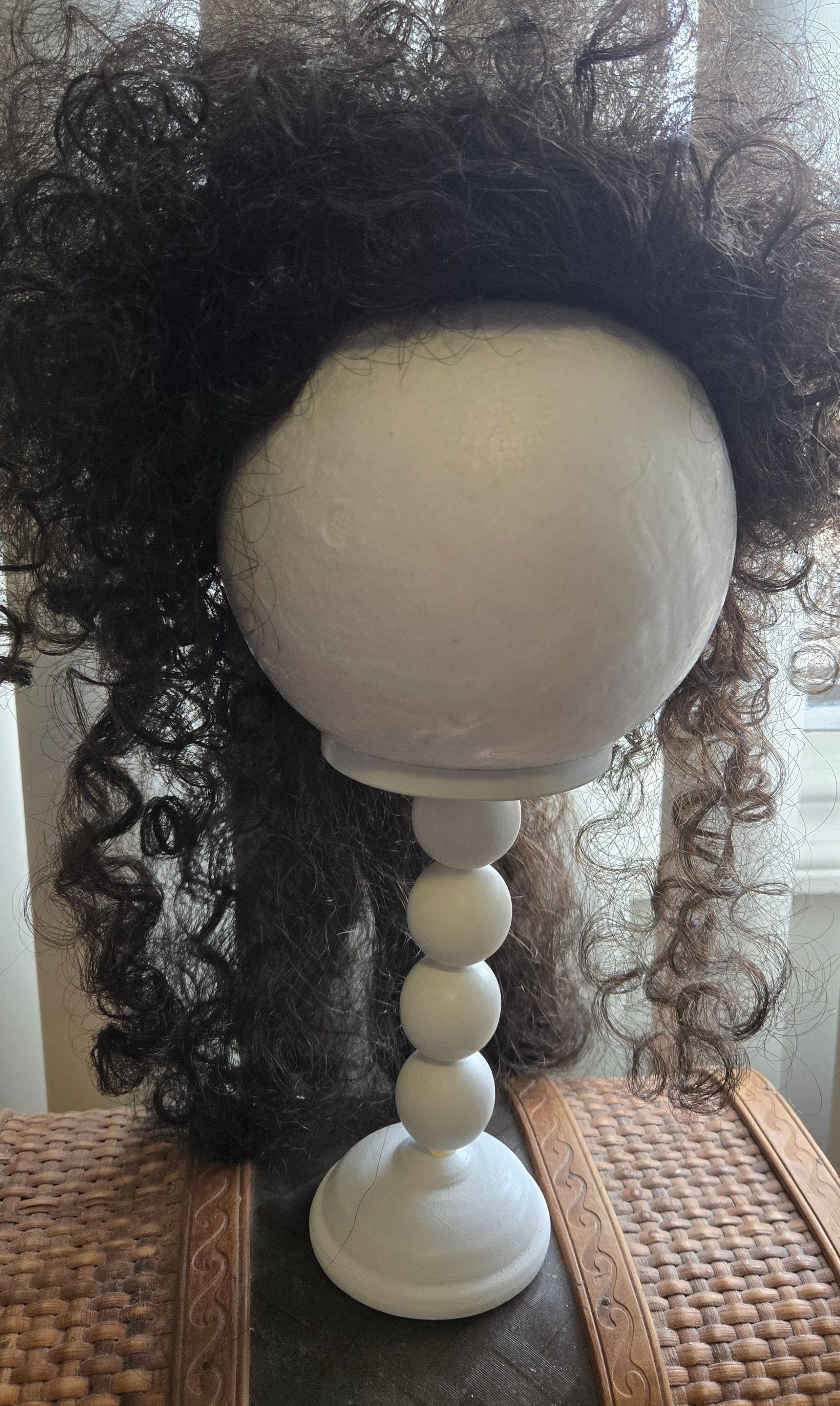 On one of her many thrifting trips, the Buyer found a candle holder that could be used for a hat stand. Trolling through the crafting section of a dollar store on the same day, and coming across styrofoam globes, she decided it would do for a wig stand instead. Good thing a measuring tape is always stored in her purse! Back at the shop, she handed over the candle stick and a styro ball just the right size, to the accessorist.