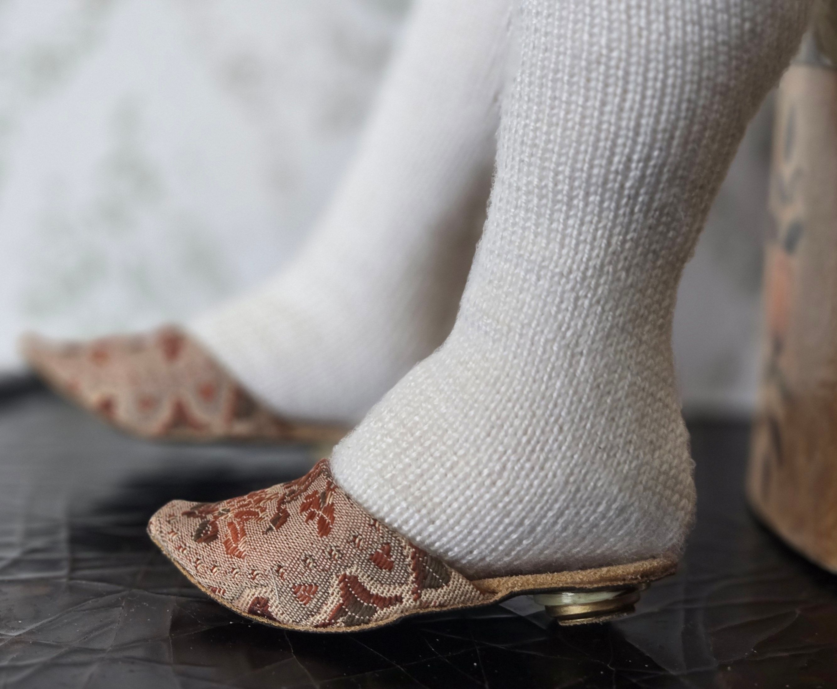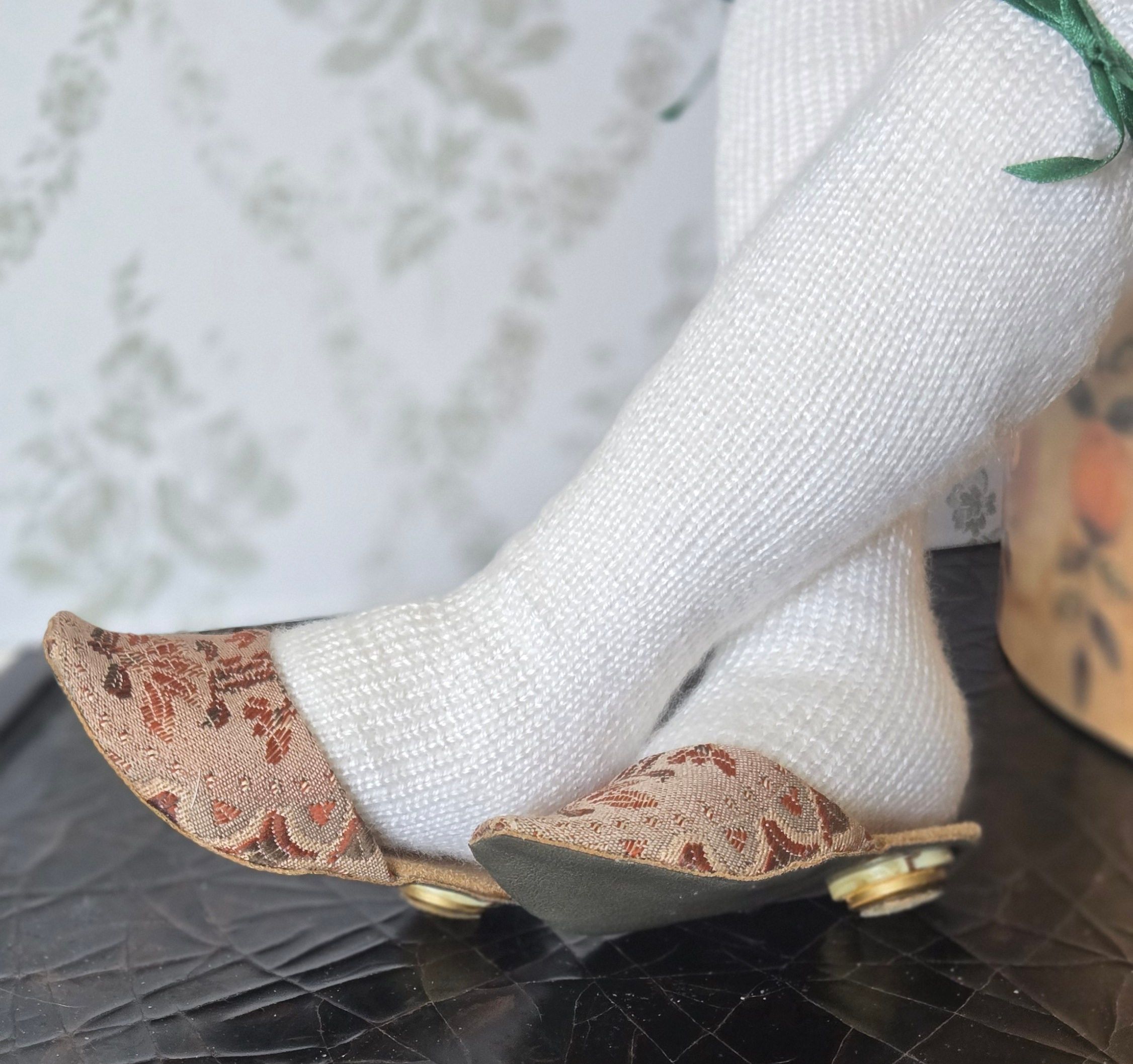 In the meantime, she chose supplies for the cordwainer to start on shoes for Addy. These included a tapestry like runner, faux leather with suede on one side, and some buttons to construct the heels. Addy approved of a slipper style shoe, or mules. Something casual that she can wear around the boudoir.